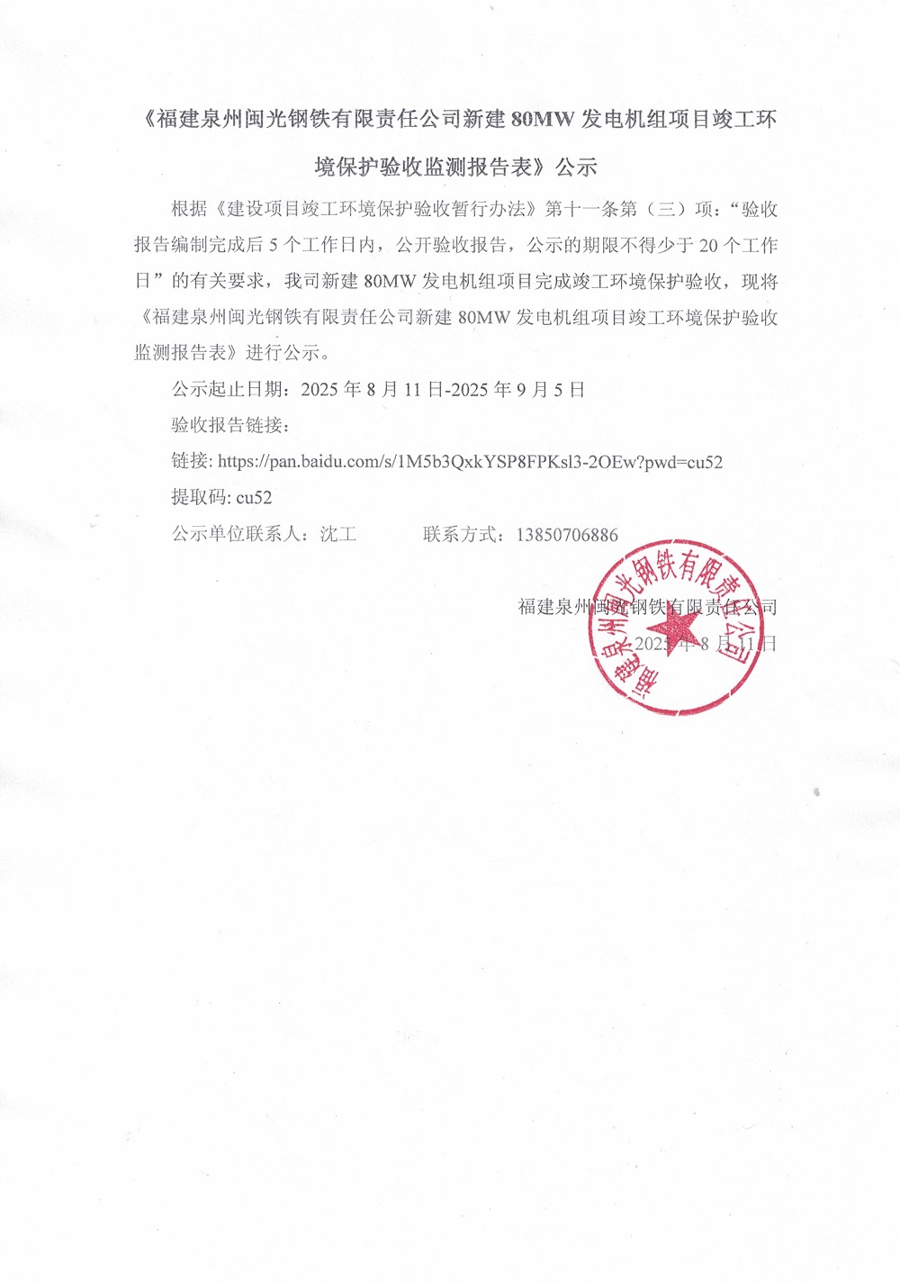《福建泉州閩光鋼鐵有限責任公司新建80MW發電機組項目竣工環境保護驗收監測報告表》公示