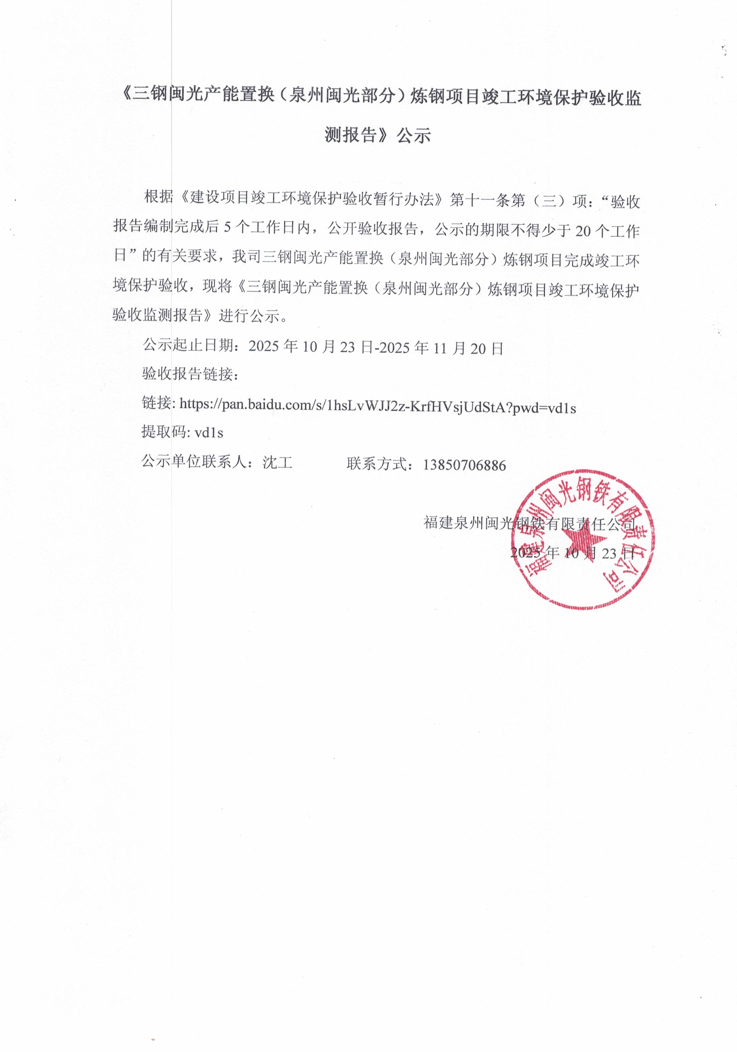 《三鋼閩光產能置換(泉州閩光部分)煉鋼項目竣工環境保護驗收監測報告》公示